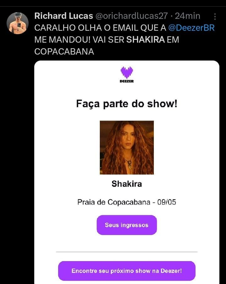 Nesta quarta (7/1). A plataforma Deezer disparou um e-mail para usuários com o anúncio: “Faça parte do show! Shakira – Praia de Copacabana, 09/05”.