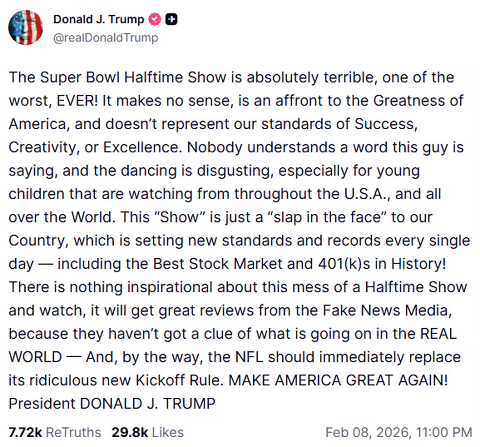 O presidente dos Estados Unidos, Donald Trump foi até suas redes sociais, na noite deste domingo (8), após show histórico de Bad Bunny no Super Bowl. Mesmo sem citar o nome, o republicano, chamou a apresentação de ‘bagunça’.
